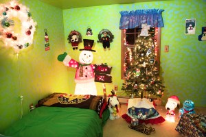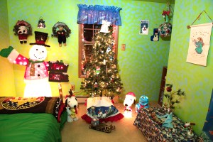 In a nearby room, a life-size Santa sits in a chair next to a twinkling Christmas tree. There are classic Peanuts characters around another tree in what was once the bedroom of the Curtis’ now-grown son.