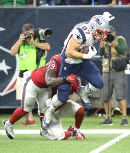 The Patriots took a 7-0 lead when former Texan Martin got away from rookie Kevin Johnson and was wide open in the end zone for a two-yard touchdown. That score was set up when Brady threw across his body and on the run to Gronkowski for a 45-yard gain earlier in the drive. Gronkowski was open after linebacker Whitney Mercilus fell trying to cover him.