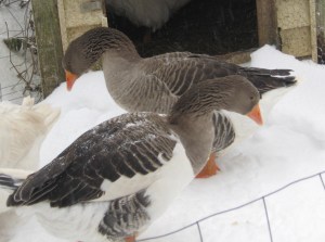 These lovely gray and white geese, now 7 months old, quickly took in stride the sudden change in the weather. They, along with Seb, my old gander, and Julie, my relatively new addition to the flock, have been getting along famously in the small goose pen ever since they were placed separately from the main flock.