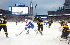 Before a crowd of 67,246 on a cloudy day with the temperature for the opening faceoff at 40 degrees, the teams dodged the slushy ice that has greeted other Winter Classic events, including the old-timers and women’s exhibitions on Thursday. Organizers compensated for the lack of snow in the Boston area so far this winter by spreading white, puffy fabric over the football field.
