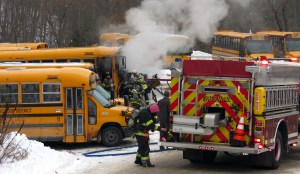 Transportation Director Dave Fontaine said the bus had been parked for about 30 to 45 minutes after its morning run and was not running when the engine compartment burst into flames. Fontaine said the cause is suspected to be electrical.