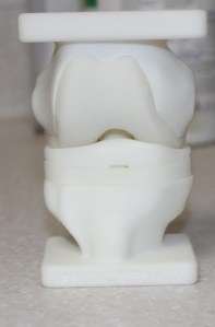 Dickey starts with a CT scan of a patient’s hip, knee and ankle to gauge alignment, rotation and joint size. Those images are then sent to a company that uses them to form a mold and create a new knee out of alloys.