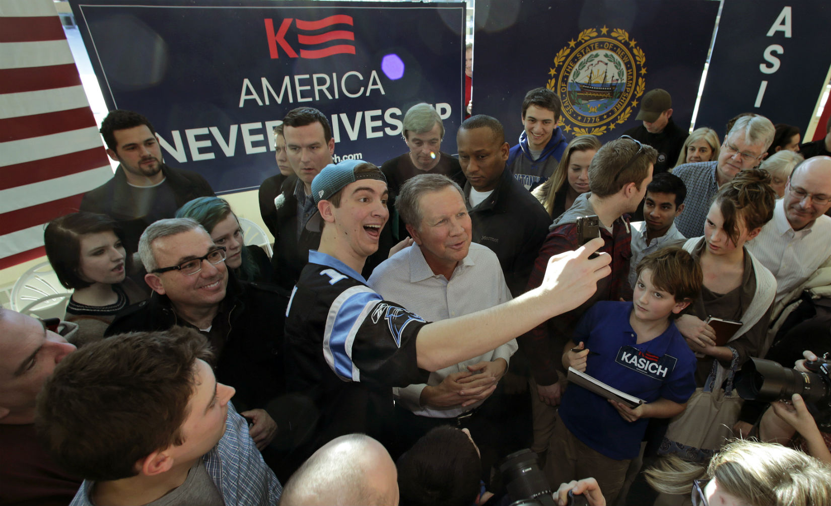Alex and Peter Tsipis, brothers from Wayland, Massachusetts, wanted to see Kasich up close to make sure he was as great a candidate as they believed. They made a 45-minute jaunt to Nashua on Sunday morning, arriving two hours early to get front-row seats. The brothers, 20 and 18 years old, respectively, came away with selfies and stronger convictions that Kasich is their guy.