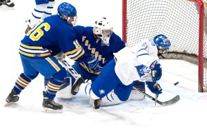 And just like against the Red Storm the night before, Lewiston responded with a goal of its own in the opening period. Yet, the Blue Devils did what they couldn’t do against Scarborough — score on the power play. Lewiston’s first man-advantage lasted just 58 seconds before Cody Doyon put home a rebound of a Cole Ouellette shot while falling down to knot the game up 1-1.