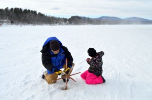 The annual Michael J. Rowe Memorial Ice Fishing Derby, hosted by the Wilton Fish and Game Club, was scheduled to run from 6 a.m. to 4 p.m., but Austin Couture of Jay and Tyler Kachnovich of Livermore arrived at 5 a.m. to get an early — and very cold — start. They were still fishing strong at 2 p.m., although neither had caught anything.