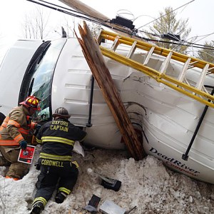 Because the broken pole was hanging over the vehicle, Poland firefighters had to wait nearly an hour for Central Maine Power to make it safe for them to extricate Grant, who was trapped in the van.