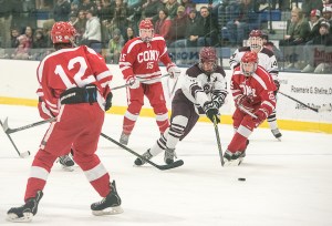 The first period looked grim at times again when the two teams met in Tuesday’s playoff battle, yet the Red Eddies hung on until the first intermission, then hung on again at the end against the Rams for a 4-3 victory in the teams’ Class A North boys’ hockey quarterfinal at Norway Savings Bank Arena.