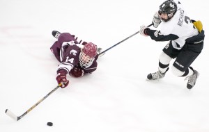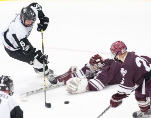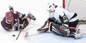 The second-seeded Saints (11-7-1) only had five shots to their name in the first, but the fifth and final one was as good as the first one. Reese Farrell won a faceoff to the rigth of the goal, and Connor Samson took Farrell’s feed and flung it past Dumont.