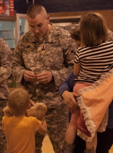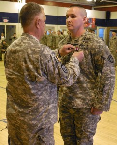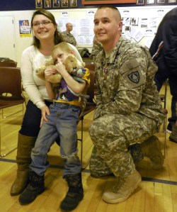 The entire Curtis family was at the Elm Street armory yesterday to witness Way receiving the Meritorious Service Medal from 52nd Troop Cmd. Commanding Officer Col. Dwaine E. Drummond. The colonel also presented Nathan with a teddy bear, bearing the insignia of the U.S. Army.
