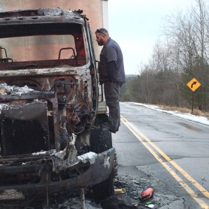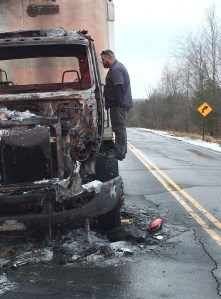 The driver said he noticed smoke coming from the front after the truck stopped suddenly. He said he immediately got out of the cab and called 911. Flames quickly appeared, and the front engine section and cab were fully involved.