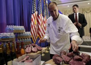A spokeswoman for Trump’s campaign did not immediately respond to a request for comment, but the labels on the steaks displayed Tuesday night appeared to match those of a company called Bush Brothers. A club staff member said that’s the butcher that supplies the club.