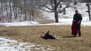 When the city’s animal control officer and a Maine warden arrived on the scene, the two eagles’ talons were locked. The two men used blankets to take the eagles into custody. Then the two raptors were separated and released on their own recognizance.