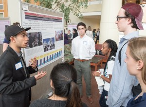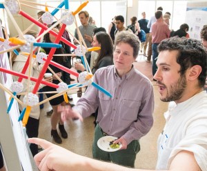 Holly A. Ewing, associate professor of environmental studies at Bates College in Lewiston, talks with senior Miles Schelling about his presentation at the 15th Mount David Summit on Friday. More than 380 students presented research posters, short talks, panel discussions, a photography exhibition, literary readings and video screenings. “True mastery of a subject or topic includes not just knowing all the key questions and answers, but being able to effectively communicate this information to a lay audience, and to persuade that audience about the significance of one’s work,” said Matt Auer, vice president for academic affairs and dean of the faculty.