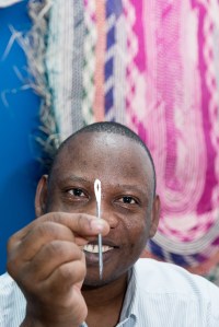 It’s startling to see how quickly he can sew together a garment, calmly tossing it aside, reaching for another bolt of fabric, and continuing on. He is sharing his tailoring and embroidery skills with apprentice Halima Mohamed.