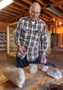 Perham called the original collection his “Cadillac” pieces, but for most of March he has been walking back and forth from his house to storage trailers across the road selecting “Ford and Chevy” specimens to refill the basement shelves emptied by the mineral museum sale.