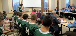 A large contingent of Oxford Hills Comprehensive High School football players appeared at the meeting in support of coach Mark Soehren and read statements asking that his position not be cut.
