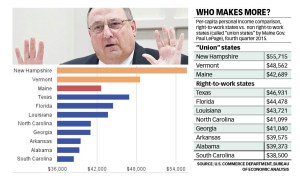“I will just tell you the honest truth and you can do your own research,” LePage said. “I don’t need to do it for you. Right-to-work states make more money than union states. It’s that simple. Texas, Alabama, Arkansas, Louisiana, Georgia, North Carolina, South Carolina, Florida: Go look at their per-capita income, their economies and then look at our economy — Maine, New Hampshire and Vermont.”