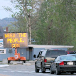 In an adjacent parking lot, in plain view, a large electronic sign displayed three alternating messages: “Weed the People.com,” “Cannabis oil cures cancer,” and “Natural Cures.”