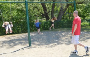 Two older daughters ran over from the play structure to sit on swings. He gave each one a push to get them going.