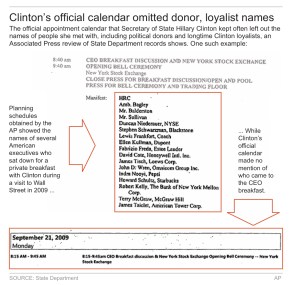 In one key omission, Clinton’s State Department calendar dropped the identities of a dozen major Wall Street and business leaders who met with her during a private breakfast discussion at the New York Stock Exchange in September 2009, The meeting occurred minutes before Clinton appeared in public at the exchange to ring the market’s ceremonial opening bell.
