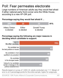 Eighty-one percent of Americans say they would feel afraid following the election of one of the two polarizing politicians, according to a new Associated Press-GfK poll. That includes a quarter who say it doesn’t matter who wins: they’re scared of both.