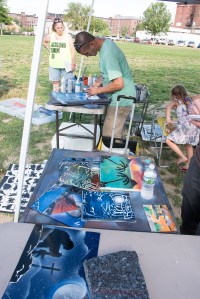 A few booths away, Mike Thurlow of Auburn was toiling away at his spray paint art, contending with paint fumes on top of the heat.