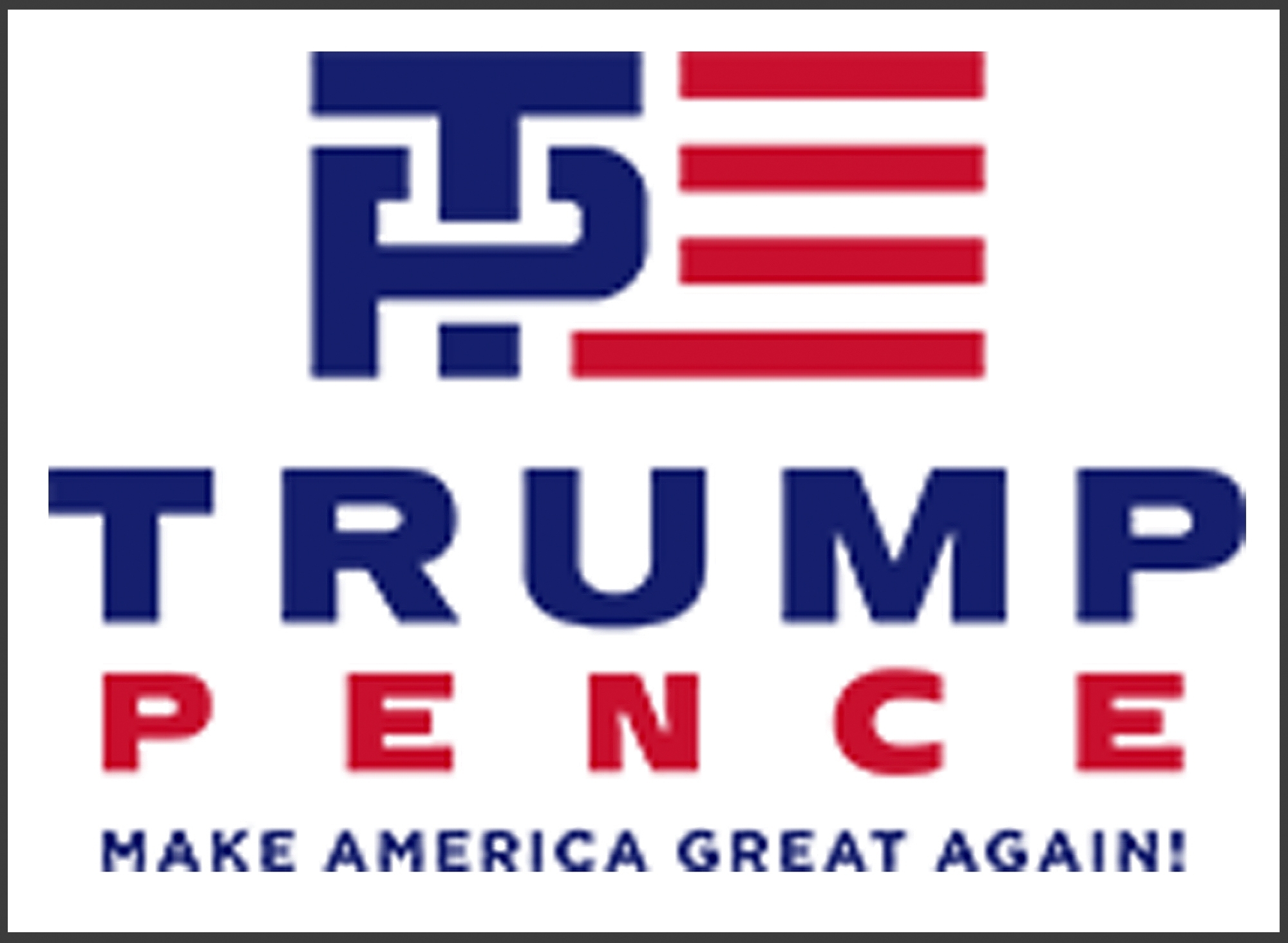 It features an interlaced blue “T” and “P” next to red stripes, evoking the American flag. Trump’s name is featured above Pence’s name, which is smaller. Trump’s campaign slogan “Make America Great Again!” finishes off the logo.