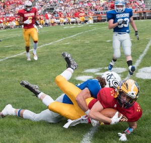 Miller almost had another touchdown on the East’s first drive of the second half, but Yarmouth’s Jack Snyder jumped in front of a Malloy pass intended for Miller at the goal line, then returned the pick 45 yards. Therrien later ran in from one yard out on fourth down to cut the game to 44-38.