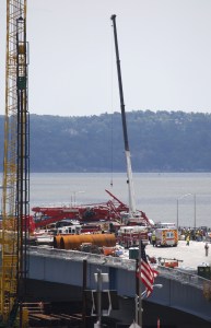 The base and treads of the huge, movable crane sat on the unfinished new bridge, which crosses the Hudson River between Westchester and Rockland counties. Part of the toppled crane lay across the old bridge, which runs parallel to the new one. Another section lay across a construction platform in the water between the two spans.
