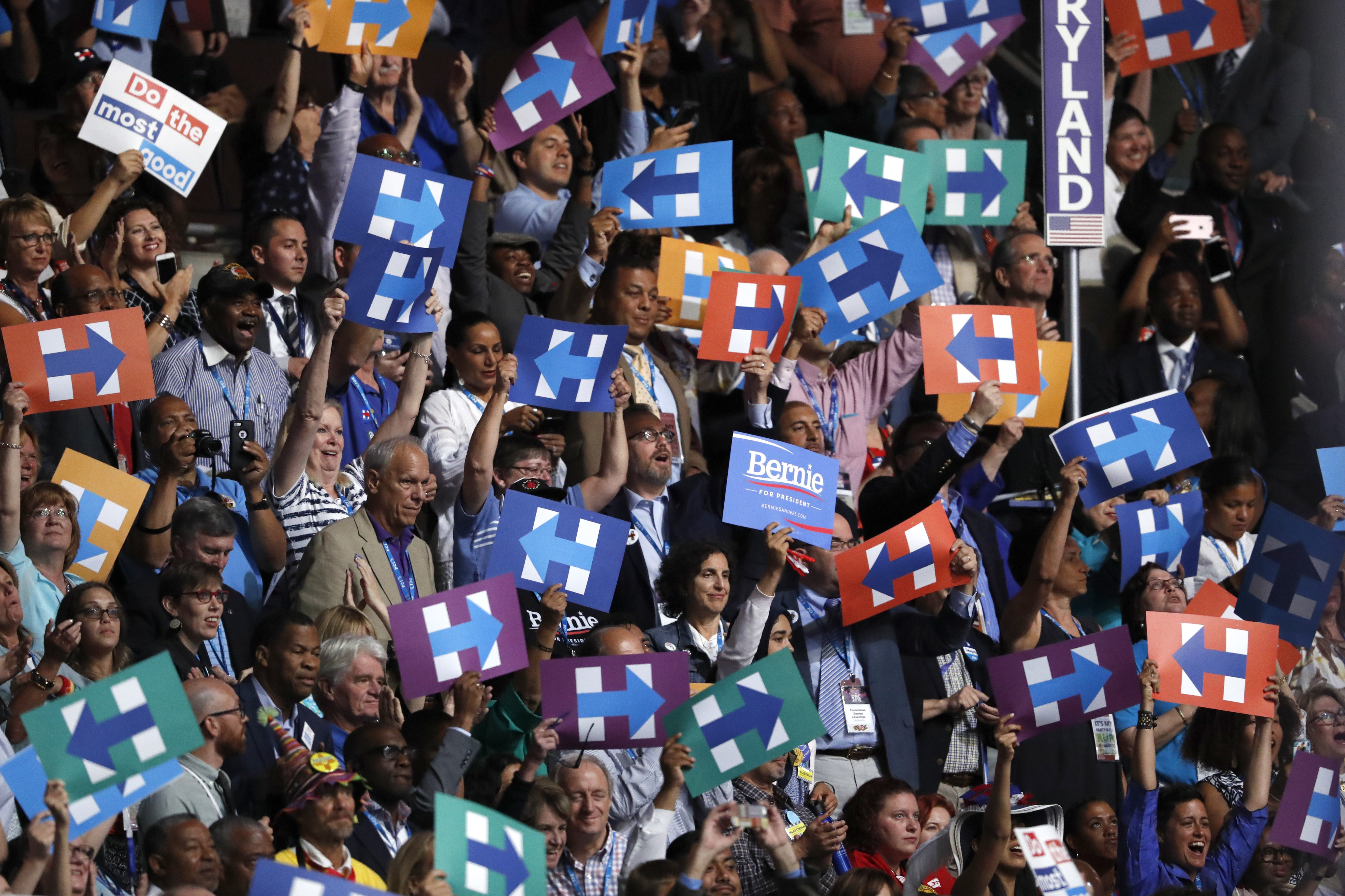 Moments after Hillary Clinton officially won the Democratic nomination for president, a large group of Bernie Sanders’ supporters left the convention hall in Philadelphia to hold a sit-in protest at a nearby tent for journalists.