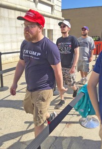 Members of the Maine People’s Alliance were removed after rising silently to hold up pocket-sized copies of the constitution. One Trump supporter tried to grab one from a protester as she left.