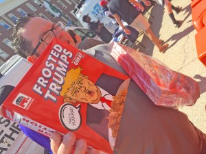 Outside Portland City Hall was Ellen Murphy, a Portlander whose father died in World War II. By military tradition, she may display a flag with a gold star on a blue field, and she held a large cardboard sign reading “Respect for Gold Star Families.”