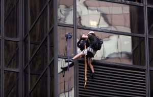 The climber wore a backpack and used a harness and rope stirrups to fasten himself to the side of the 68-story Manhattan skyscraper on Wednesday. He climbed as high as the 21st floor before officers grabbed him.