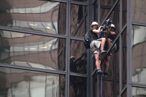 The climber kept his distance by methodically working his way back and forth across the facade, repeatedly repositioning suction cups resembling a type commonly used by window washers to remove big panes of glass.