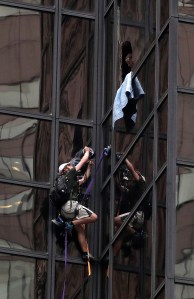The man played a slow-motion cat-and-mouse game with his would-be rescuers as he climbed Trump Tower. Officers smashed windows and broke through ventilation ducts to block his progress. Police also lowered themselves toward the man using a window washer’s platform.