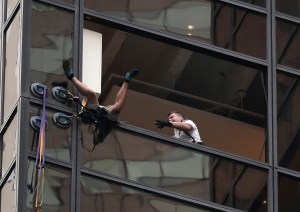As a crowd gasped on the street below, two officers leaned far out of a window, grabbed the climber’s arm and harness, and in a flash yanked him from his dangling stirrups. He went through the opening head first, his legs pointed skyward.