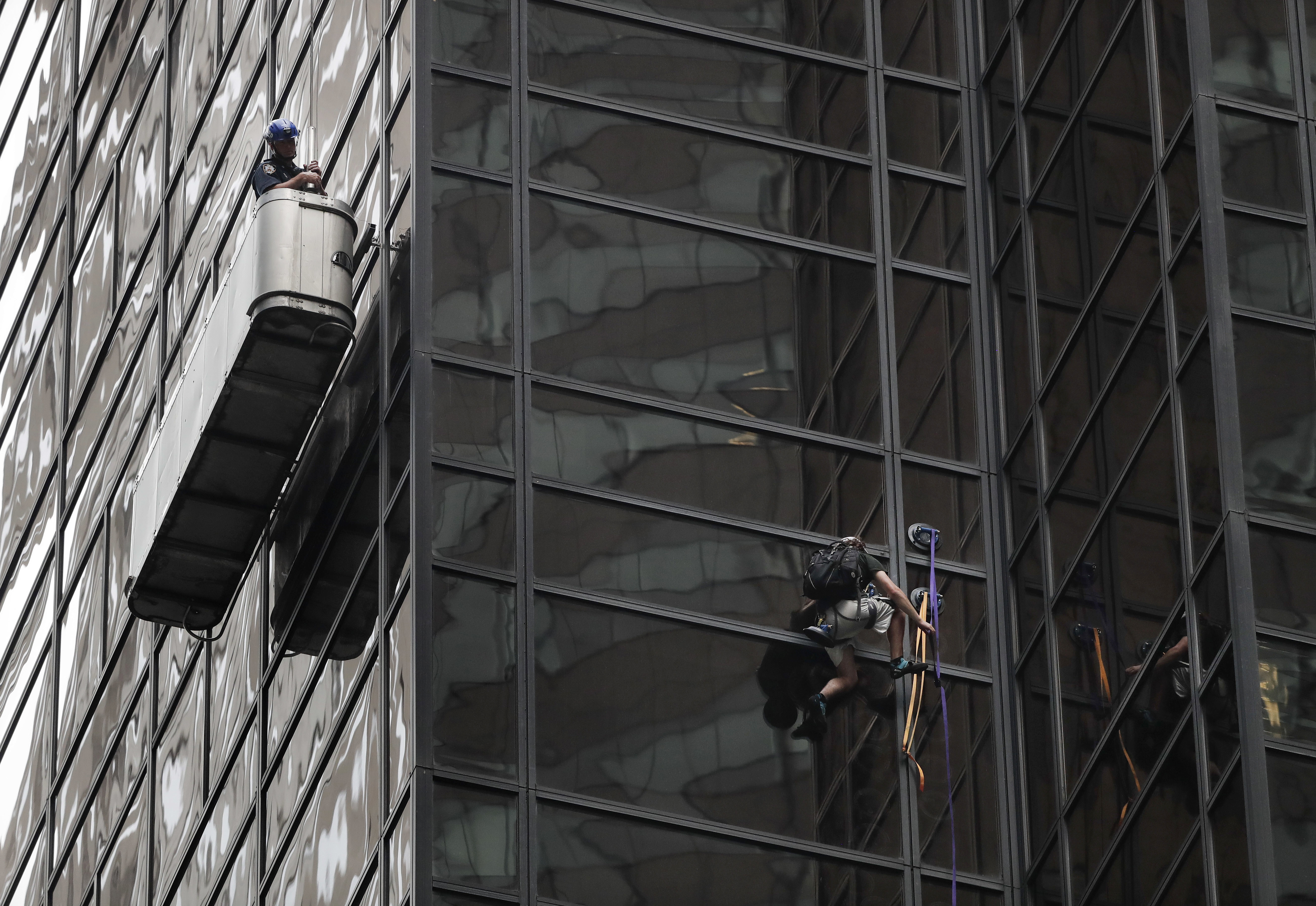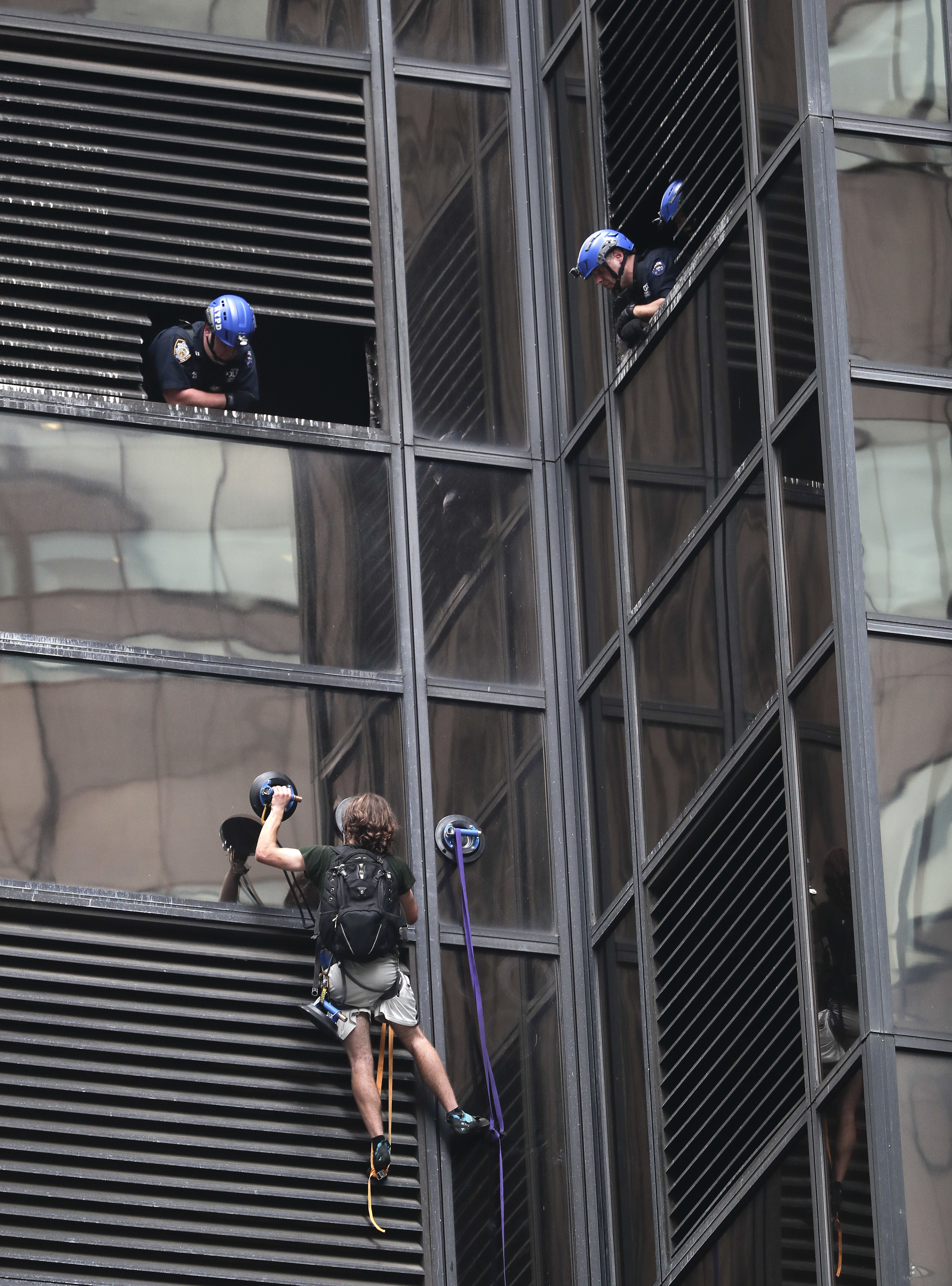 The climber wore a backpack and used a harness and rope stirrups to fasten himself to the side of the 68-story Manhattan skyscraper on Wednesday. He climbed as high as the 21st floor before officers grabbed him.