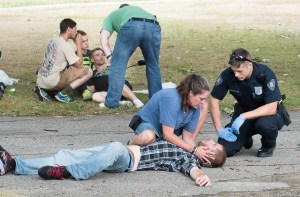 Witnesses reported that one man was stomped repeatedly in the head after a fight broke out at about 6:15 p.m. in the park near the corner of Bates and Pine streets.
