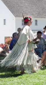 Passamaquoddy elder Mary Creighton in traditional regalia dancing to the Burnurwurbskek Singers from the Penobscot Nation.