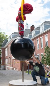 As he lined it up with a metal rod that would hold it in place, he bellowed: “Let it drop!” With that, the punny art thumped into place.