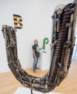 The small “iron-e” now has a big brother: a large e, the bigger “Iron-e.” There is a B that looks like a bumblebee. A K made from croquet mallets. “C-saw” is a giant C with teeth that look like a backward saw blade. And pushing the envelope a bit, dozens of screws are formed into the letter U.