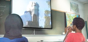 So Gilbert creates a kind of simulation of that day using video footage from the time, including shots of people jumping from the towers in a desperate attempt to save their lives. Students hear the goodbye phone calls victims made to their families and watch eye-witness interviews.