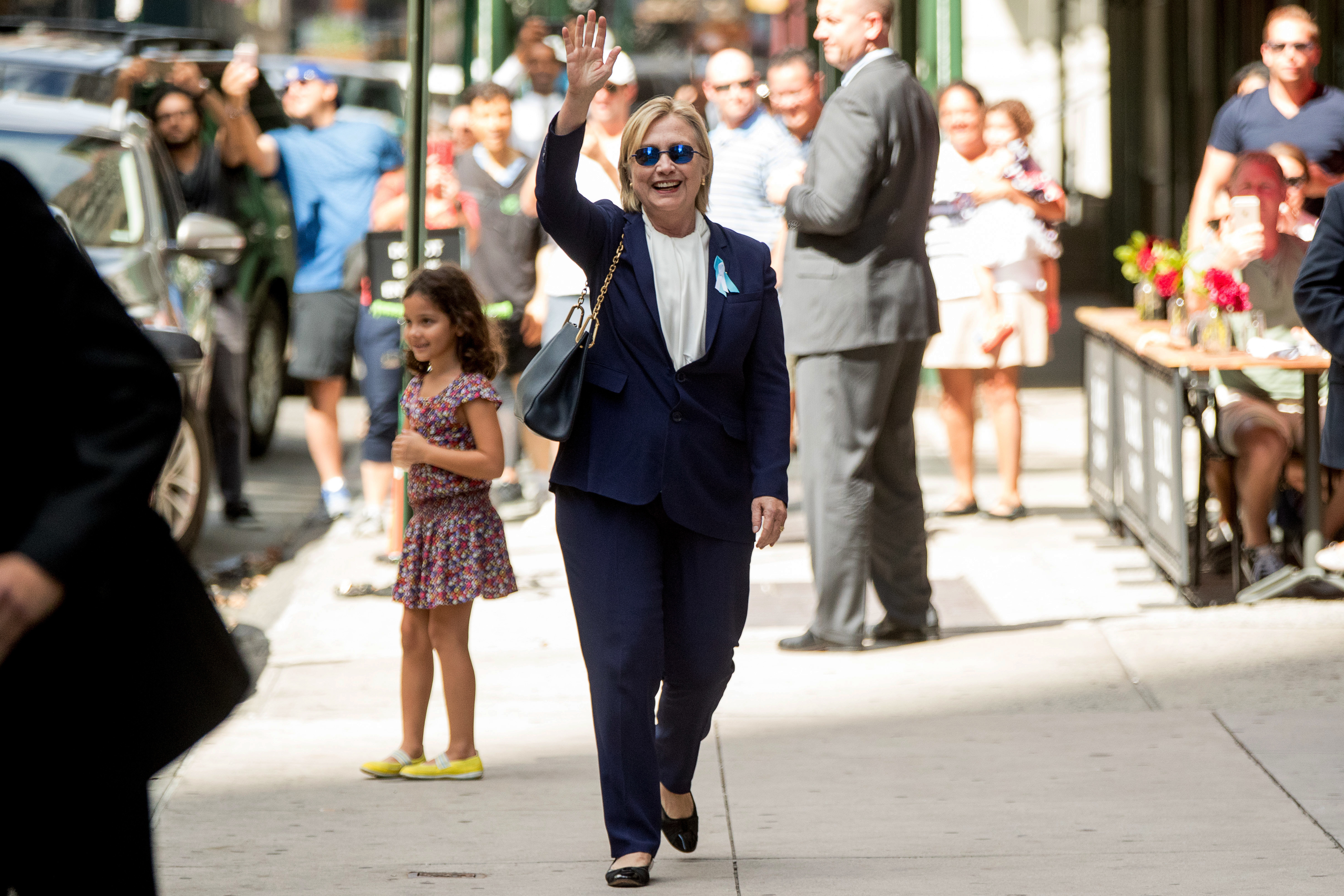 Clinton exited the apartment on her own shortly before noon. She waved to reporters and said, “I’m feeling great. It’s a beautiful day in New York.”