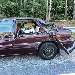 The bucket of a front-end loader sideswiped the 1993 Pontiac Grand Am the Lewiston man was driving north before 5 a.m. between the New Gloucester barrier toll and the Auburn exit.