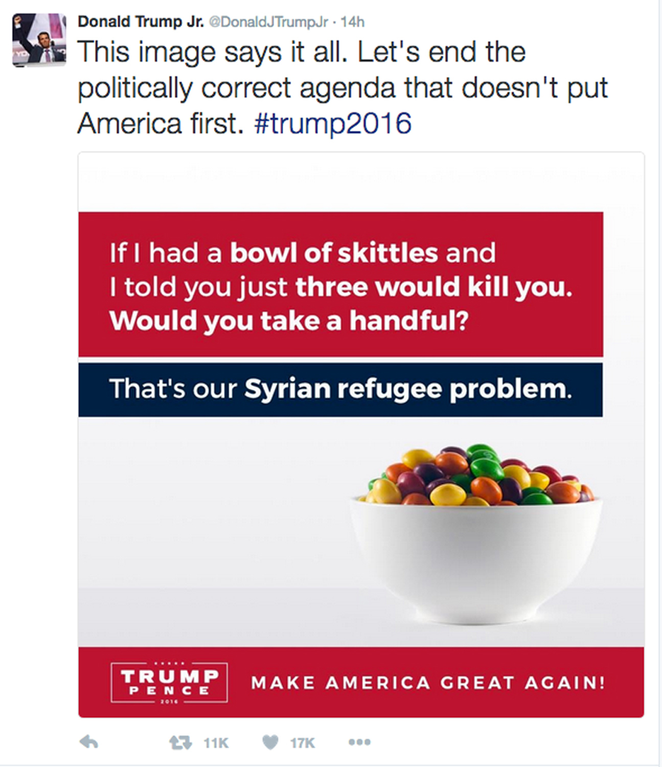 “If I had a bowl of skittles and I told you just three would kill you, would you take a handful?” said the tweet on the verified @DonaldTrumpJr handle.