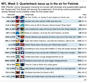 Brissett’s opportunity comes because of two unusual factors. Tom Brady, the team’s cornerstone, is suspended four games for his role in using underinflated footballs in the playoffs in 2015. And Brady’s backup, Jimmy Garoppolo, has a shoulder injury and is listed as doubtful for Thursday.