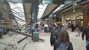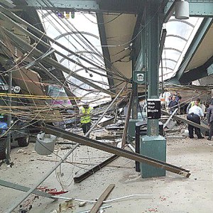 Witnesses reported seeing one woman trapped under concrete and many people bleeding after the arriving New Jersey Transit train crashed through a barrier at the end of the track. The train came to a halt in a covered area between the station’s indoor waiting area and the platform, collapsing a section of the metal shed roof.