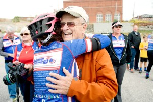 The 11 riders, most from from South Carolina or points south, arrived at about 3:30 p.m., right on schedule. They gathered at Veterans Memorial Park, where they were greeted by their fans. There were hugs all around. The riders barely looked winded at all.