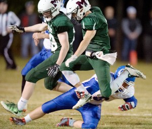 Brown and Scott again accounted for the bulk of the offense, but luck helped out. Quarterback Matt Ingram threw a pass into a crowd of players; the ball bounced off a Raider and into Scott’s hands for a 13-yard gain.