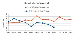 Parched conditions are continuing. Tom Hawley of the National Weather Service in Gray said, “September rainfall was well below average for the entire state. Many locations in southern Maine received less than one inch for the month.”